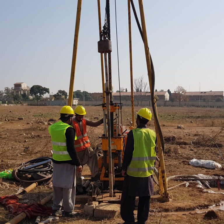 Geotechnical Investigation: Geoengineers conducted detailed Geotechnical Investigation of FGEHA tower in G-13/4. 10 No’s of boreholes were drilled to asses ground situation for foundation design.